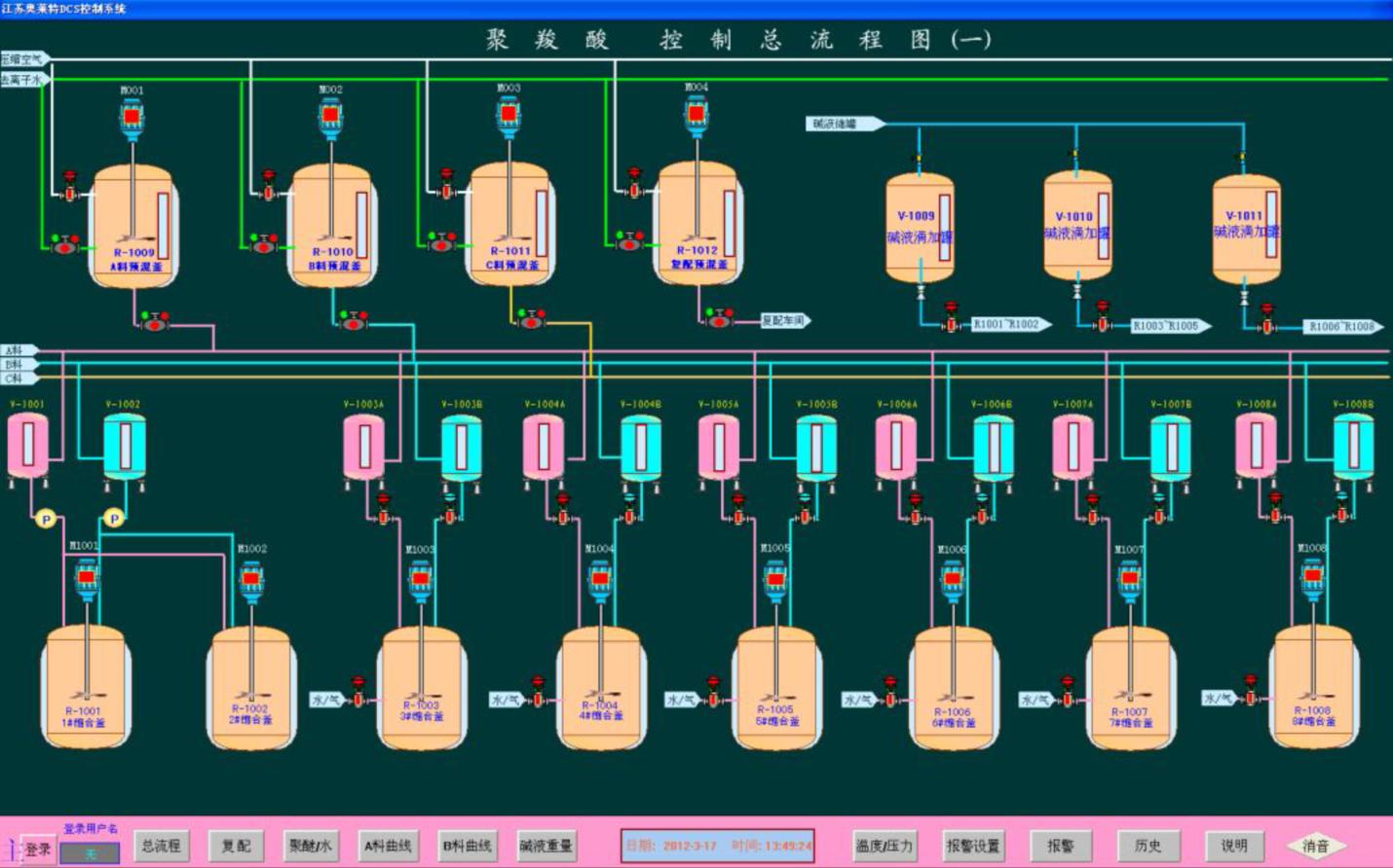 3.主畫面為縮合車間反應(yīng)界面,可通過最下方菜單內(nèi)的不同按鈕切換畫面。可快速切換至反應(yīng)界面,報(bào)警界面,歷史數(shù)據(jù)曲線,實(shí)時(shí)曲線等畫面。